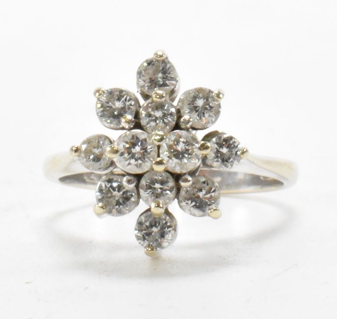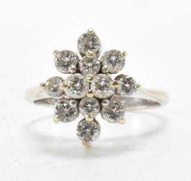 A hallmarked 18ct white gold and diamond cluster ring. The ring being set with twelve brilliant cut diamonds. Import marked London 1976. Weight 4.1g. Size J. Diamonds estimated 0.76ct.