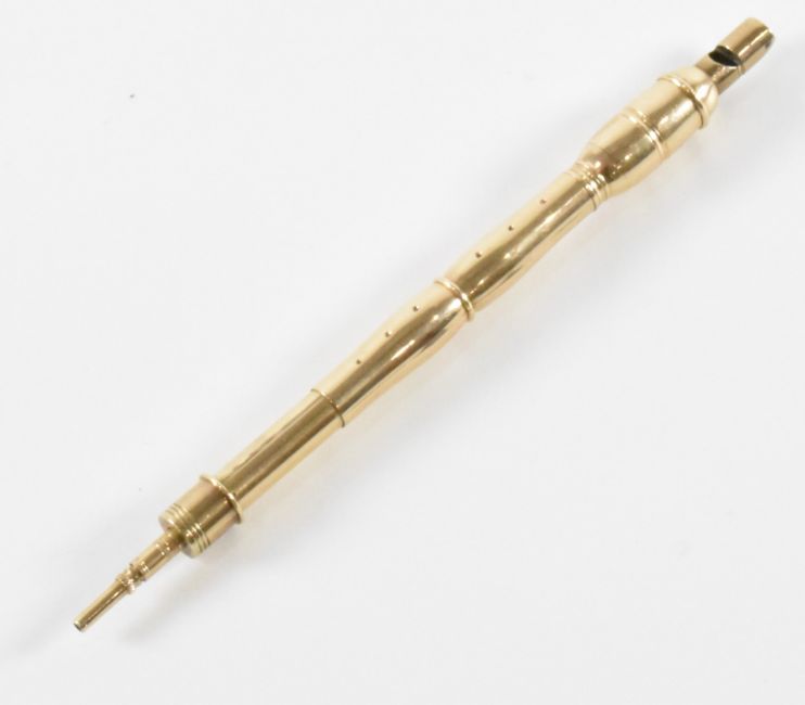 A vintage gold propelling pencil in the form of a recorder with a whistle to the top. Unmarked tests indicate 9ct gold. Measures 9.8cm. Weight 10.5g.
