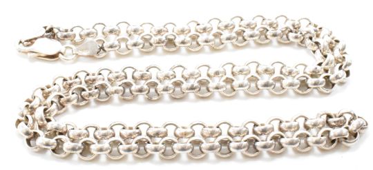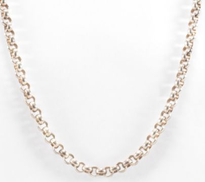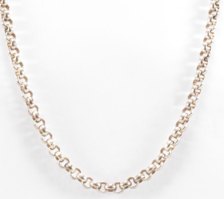 A silver hallmarked necklace chain with round links and a lobster clasp. Assay marked Sheffield with 925 common control mark. Measures 24 inches. Weight 55.0g.