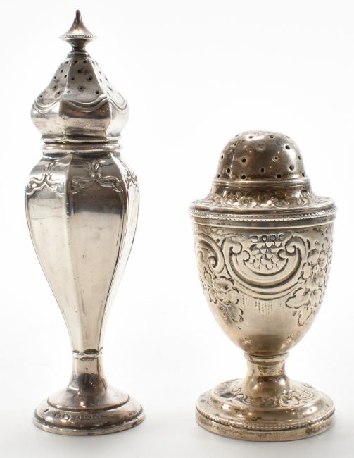 Two 19th Century / Edwardian early 20th Century silver hallmarked pepper cruets. The lot to include a domed lid pepper pot with repousse detailing raised on a round foot (hallmarked rubbed, but London assay partially visible), and a pepperette with faceted sides and a finial top (hallmarked Birmingham 1904, Henry Matthews). Measures 10.5 and 8cm tall. Total weight 71.3g.