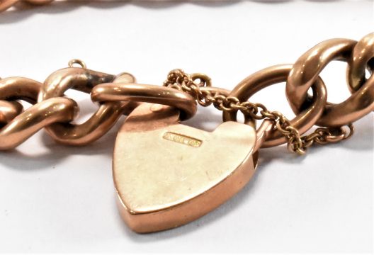 An early 20th Century 9ct gold curb link bracelet with a heart lock clasp. Hallmarked 9ct to the heart clasp, each link marked 9ct gold. Measures 7 inches. Weight 19.7g.