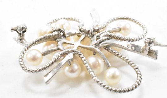 A group of vintage pearl jewellery to include a platinum and pearl Mikimoto brooch in the from of a floral spray (tests indicate platinum, makers marks to verso, AF, clasp damaged), two cultured pearl necklaces, a multi strand simulated pearl necklace, and some loose simulated pearls. Mikimoto brooch measures 4.5cm wide. Weight 10.5g.