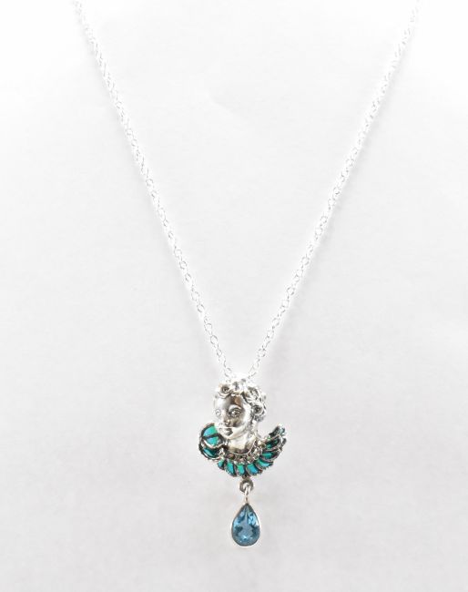 A silver, plique a jour and topaz pendant necklace. The fine link chain having a pendant in the form of a cherub with pilque a jour enamelled panels and tear crop cut topaz suspended below. Pendant marked 925 to verso, marked 925 to the jump ring. Chain measures 18 inches. Pendant measures 3.5cm.