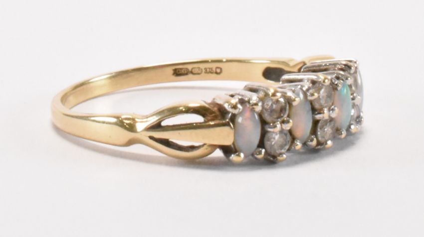 A hallmarked 9ct gold and cz ring being set with four opal cabochons alternated with round cut CZ's. Assay marked London. Weight 2.1g. Size P.