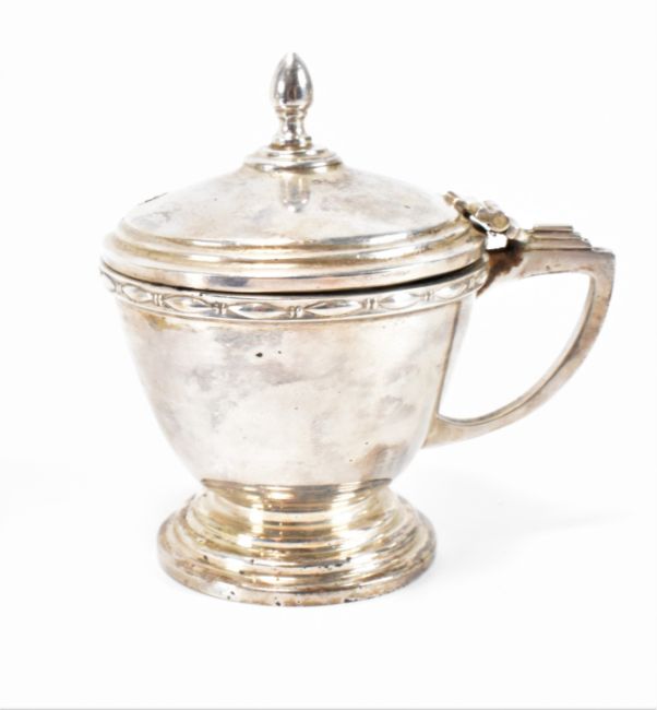 A vintage mid 20th Century silver hallmarked cruet set to include mustard pot, table salt, and pepper pot. All having round stepped bases with moulded borders, the mustards and salt having blue glass liners. Hallmarked Birmingham 1946, sponsors marks for Joseph Gloster Ltd. Measures tallest measures 9cm tall. In leatherette box. Together with one unassociated silver hallmarked cruet spoon. Total weight 155.7g.