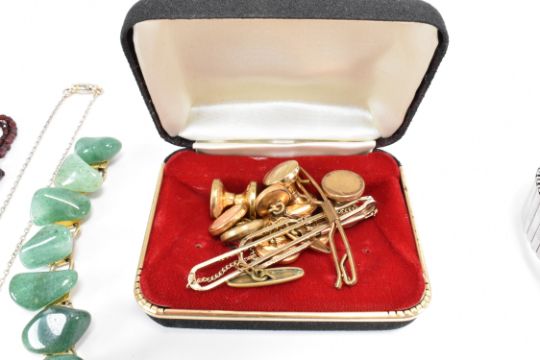 A collection of vintage costume jewellery to include an aventurine quartz belt and bracelet, a micro mosaic brooch, a tigers eye beaded necklace and brooch, a selection on rhine stone jewellery, a red stone beaded necklace, a selection of watches to including Omega, Rotary, Bulova, Delfin, Rotary, a selection of gold plated cufflinks and tie clips and a selection of hat pins.