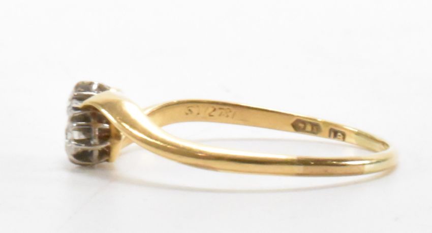 An 18ct gold and diamond crossover ring. The ring being set with two round cut diamonds in basket settings. Marked 18ct to the shank, tests indicate 18ct gold. Diamonds estimated 0.16ct in total. Weight 2.2g. Size S.