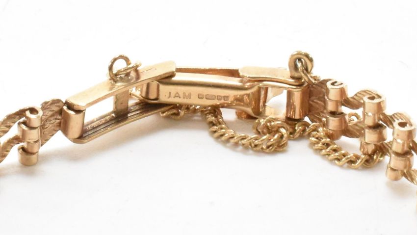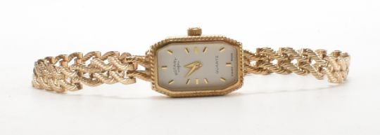 A hallmarked 9ct gold Rotary Quartz cocktail watch. The watch having a rectangular face with a white dial and baton numerals to the chapter ring. The watch being set to 9ct gold a bracelet strap. Clasp hallmarked Birmingham 1990, interior case import marked London 1989. Weight 11.4g. Interior bracelet circumference 15.5cm. With box.