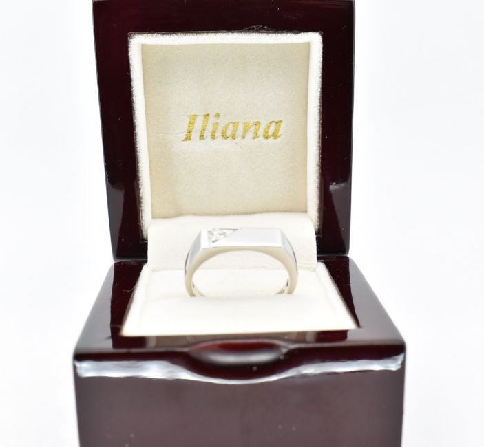 A hallmarked 18ct white gold and diamond signet ring. The ring set with a round brilliant cut diamond to plain shank. Estimated diamond weight 0.10ct  Weight 5.8g. Size U.5.