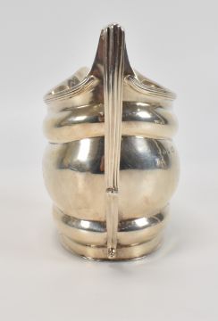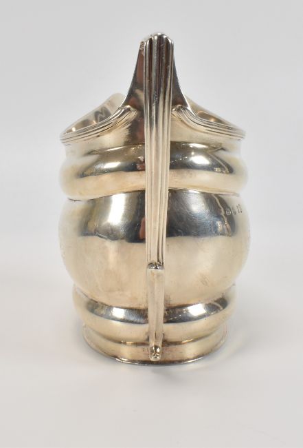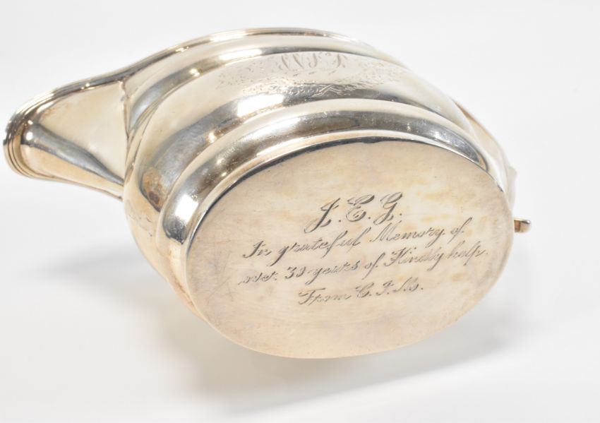 An early 19th Century George III silver hallmarked creamer jug. The jug having a reeded rim with stirrup moulded handle and engraved initial panel to the side with floral detailing. Hallmarked London 1800. Possible French Weevil mark to jug spout. Weight 168.1g. Measures 11 x 14.5cm. No makers mark present, inscription to the base.