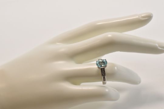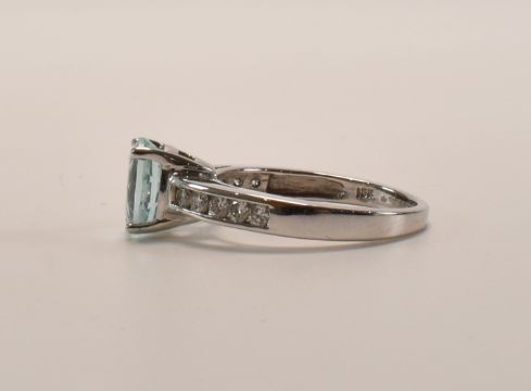A hallmarked Iliana 18ct gold Paraiba tourmaline and diamond ring. The ring set with an oval cut Paraiba tourmaline flanked by diamond set shoulders to plain shank. Hallmarked London. Weight 4g. Size M. Tourmaline measures 6 x 8 x 4.5mm. Estimated total diamond weight 0.15ct. Cased.