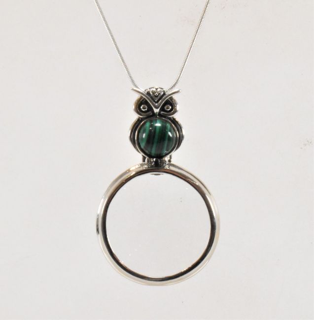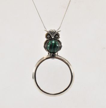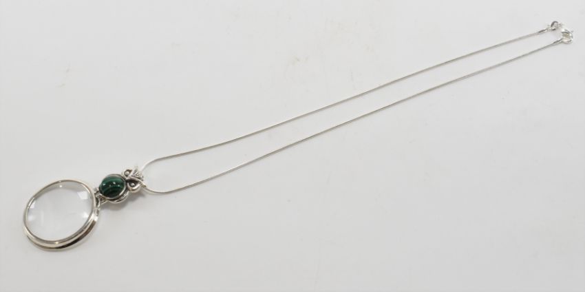 A silver and malachite magnifying glass pendant necklace. The necklace having a snake chain with a magnifying glass pendant having a owl formed malachite handle. Marked 925 to the handle and jump ring. Chain measures 18 inches, magnifying glass measures 5.3cm. Weight 17.5g.