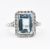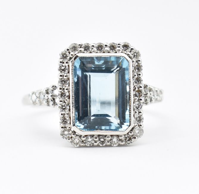 An aquamarine and diamond cluster ring. The ring set with a central large emerald cut aquamarine framed by round brilliant cut diamonds having diamond set shoulders to plain shank in white gold. 30 Round brilliant cut diamonds estimated total diamond weight 0.50ct. Aquamarine measures 10 x 7.5 x 4.7mm. Unmarked tests indicate 18ct gold.  Weight 5g. Size Q
