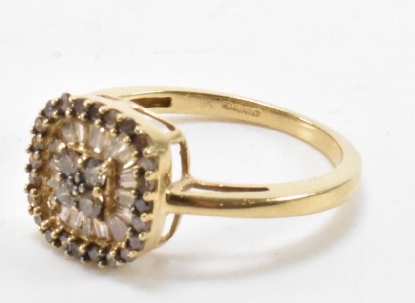 Two hallmarked 9ct gold and diamond cluster rings. The lot to include a ring with a square head set with baguette and round cut diamonds (hallmarked Birmingham 2012, size N) and a cluster ring having a round head set with round diamond accents and further accent stones to the shoulders (assay marked Sheffield, size L.5). Weight 3.9g.