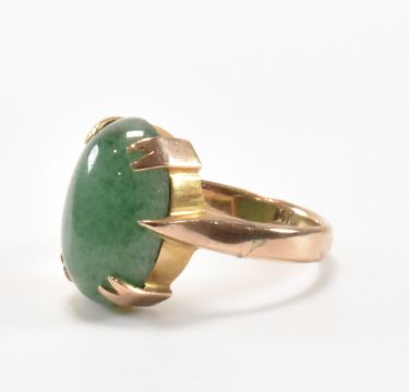 A vintage gold and aventurine quartz ring. The ring being set with an oval aventurine quartz cabochon within a claw mount to plain tapering band. Band marked 14k, tests indicate 14ct gold. Weight 4.4g. Size N.