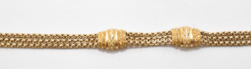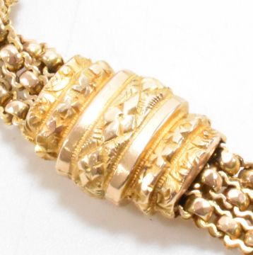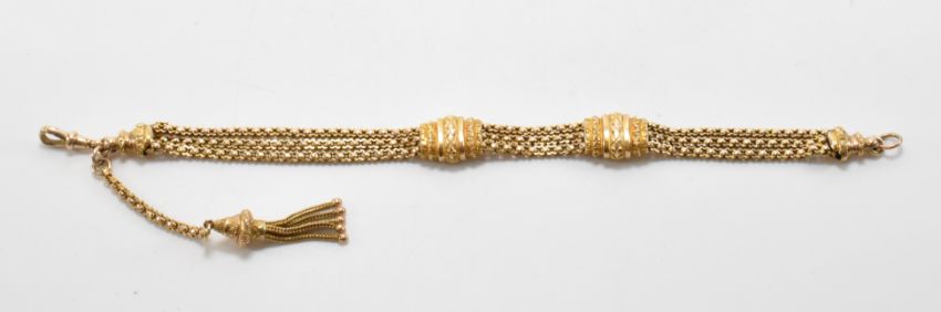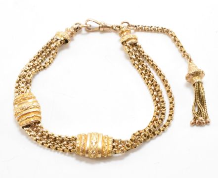 A 19th Century Victorian 9ct gold bracelet chain. The necklace having three fancy link chains with sliding links, a swivel clasp and tassel suspended below. Marked 9ct to the swivel clasp. Measures 9 inches. Weight 20.9g.