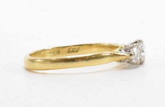 A hallmarked 18ct gold and diamond three stone ring. The ring being set with three round brilliant cut diamonds. Diamonds estimated 0.25ct in total. Hallmarked London 1996. Weight 2.0g. Size G.