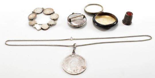 A collection of silver jewellery to include an early 20th Century silver coin bracelet, a silver vanity compact with mirror to the interior, a Victorian silver roundel brooch marked West's Patent to verso, a white metal Louis XV coin pendant necklace (clasp marked 925) and a Charles Horner thimble with a red stone panel to the top. Thimble hallmarked Chester 1918. Bracelet measures 7 inches, brooch measures 3.8cm wide, compact measures 5cm wide, necklace chain measures 22 inches. Weight 97.4g.