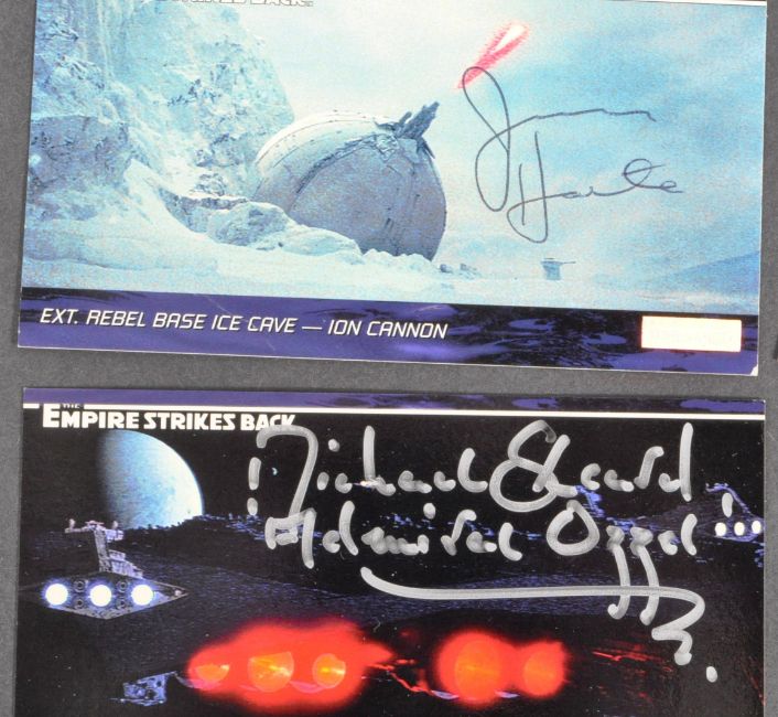 Star Wars - The Empire Strikes Back - a collection of x6 autographed Topps Widevision made officially licensed trading cards, each signed by an Imperial cast member. Autographs comprising: Julian Glover (x2), Michael Sheard (1938-2005) (x2), Jerry Harte, and a dual-signed card by Julian Glover and Jerry Harte. All undedicated, each obtained personally by the vendor from various events.