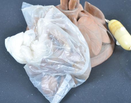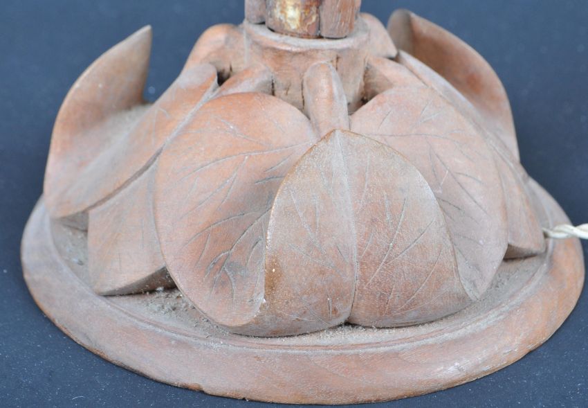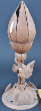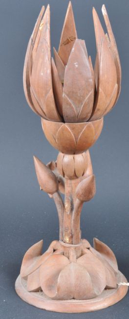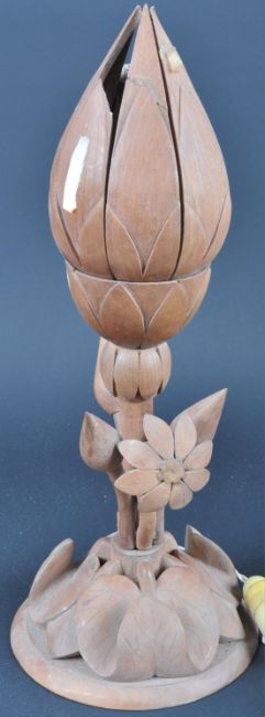 A retro mid 20th Century carved hardwood and mahogany metamorphic desk / table lamp. The top in the form of a lotus flower, which opens when the base is turned to reveal the bulb holder. Raised on a carved stem trunk, with additional carved florals to the base. Measures approx; 38cm tall.