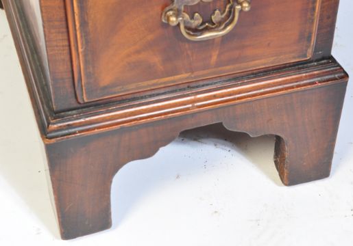An 18th century revival mahogany and cross banded kneehole desk. The desk raised on bracket feet with a bank of drawers to each pedestal having recessed cupboard to the dog kennel centre. Further drawers above with flared crossbanded desk surface. Oak lined drawers. Measures 78cm x 83cm x 48cm.