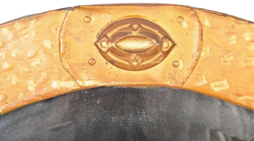 A large early 20th century Arts & Crafts oval wall mirror in the manner of Newlyn. The planished oval frame with inset bevelled mirror glass.