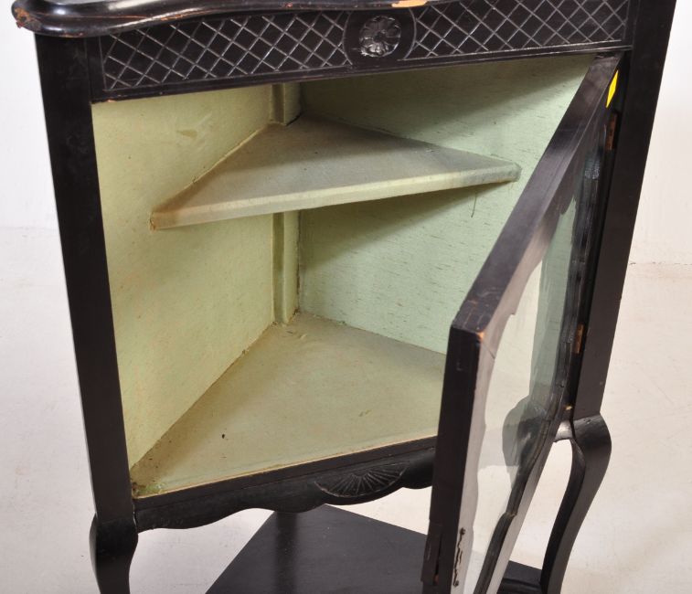 A late 19th century Victorian Aesthetic Movement ebonised corner cabinet. The cabinet having a single glazed display cabinet   and open shelf beneath. All raised on slender serpentine legs. Measures 101cm x 62cm x 36cm.