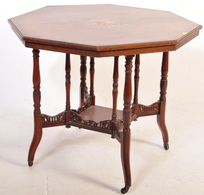 A late 19th century Victorian rosewood and marquetry inlaid centre table in the manner of Edwards & Roberts. The table being raised on turned legs with pierced gallery edge lower tier centre on stretchers. Above, a fitted frieze with octagonal top having floral spray inlaid centre. Measures 76cm x 91cm.