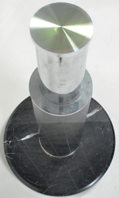 A retro vintage late 20th Century chrome, glass and marble pedestal dining table having a circular glass top raised on an inverted tapering chrome and black pleather column. All being raised on a black marble base. Wear commensurate with age, mostly to the glass top. Measures approx; 88cm x 150cm diameter.
