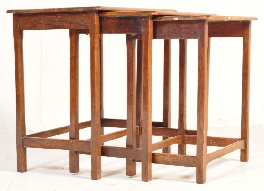 An early 20th century solid oak arts & crafts design nest of tables. Each table being raised on squared legs united by peripheral stretchers having graduating tops to each. Measures approx: 50cm x 51cm x 34cm.