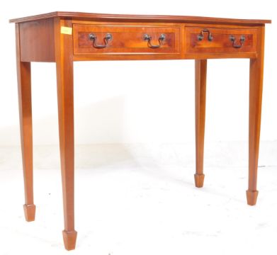A 20th century Regency Revival yew wood serpentine fronted console / hall table. The table with square tapering legs and spade feet  having shaped top over three drawers to the frieze. Crossbanded top above. Measures