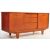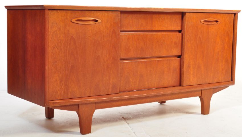 A 1960's retro vintage Jentique teak wood sideboard of usual form and small proportions having a central bank of three drawers flanked by two shelved cupboards, all raised on shaped tapering legs. Measures 61cm x 128cm x 45cm.
