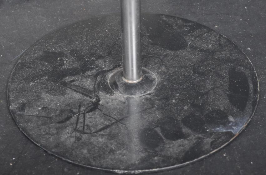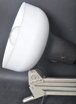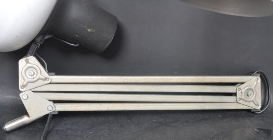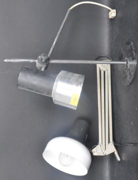 A retro vintage mid 20th century desktop lamp having a conical lightshade with adjustable rise and fall support raise on a circular support. Together with another.