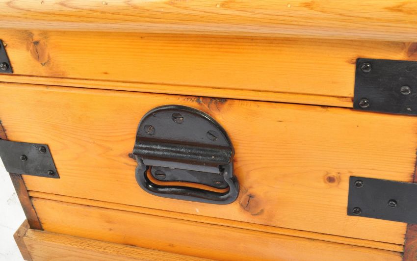 A Victorian 19th century pine blanket box chest raised on a plinth base with ebonised cast metal bracket work, hinged top above. Together with another Victorian pine blanket box chest with plinth base and hinged top. Measures 42cm x 94cm x 47cm.