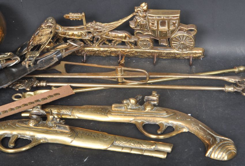A large collection of vintage 20th century brassware to include an assortment of novelty horse brasses to include a series of zodiac sign brasses held on a leather strap alongside others, wall plaques, table bells, weights, figures, a pair of shop style scales, fireside items and replica wall pistols.