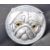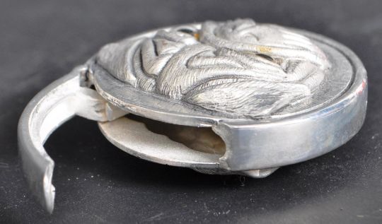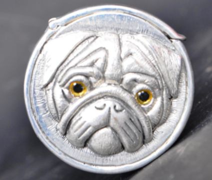 A silver plated vesta case of circular shape in the form of a pug dog with moulded raised features and amber glass eyes. Hinged lid and match strike to the base. Marked 800. Measures 41mm.