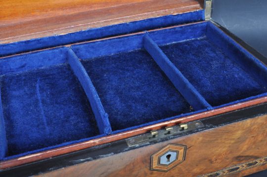 A 19th century Victorian walnut burr and herringbone  inlaid box having a octagonal mother of pearl panel to the lid and escutcheon. The interior to reveal a writing slope remodelled into a jewellery box with blue velvet lining. Measures 4cm x 23cm x 35cm.