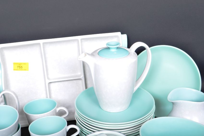 A large collection of vintage retro 20tjh century Pooler pottery tea & dinner service pieces in the Ice Green & Seagull pattern. Comprising of teacups, coffee cups, saucers, side plates, cake plates, a coffee pot, milk jug, condiment pots and a Poole sugar bowl in another Poole pattern.
