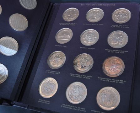 A vintage 20th century Franklin Mint Thomason Medallic Bible having a collection of 60 medallions portraying various scenes from the bible. Originally printed 1830. Medallins are inspired by Veronese, Bandelli, Titian, Rubens, Rembrandt, Michelangelo, Van Dyck, Corregio and more.