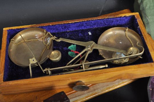A collection of vintage 20th centurt Tobacciana items to include pipes, vesta cases and more. Collection also includes opium scales with stand and faux tortoise shell box. The box has two glass jars set within.