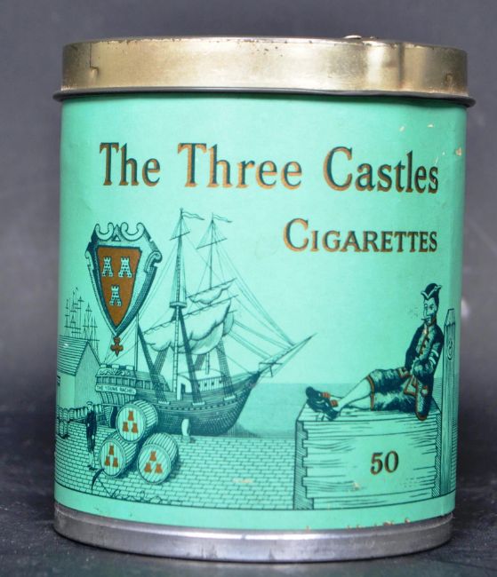 A mid 20th century Three Castles Cigarette tobacco tin of cylindrical form having a paper label. Stamped WD & HO Wills Bristol & London to the lid. Measures 8.5cm