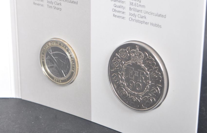 A 2016 16 coin Brilliant BU United Kingdom Annual Coin Set from Royal Mint RM annual sets. Some scratching to outer slide case. Measures 20cm x 14cm.