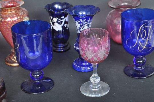 A collection of Victorian 19th century and later cranberry glass to include bohemian style gilded pieces acid etched pieces and hand painted examples. Also accompanied by a selection of cobalt glass, with the whole collection comprising of vases, pots, coupe glasses, decanters, and drinking goblets. Measures 20cm tall. Some age related wear.