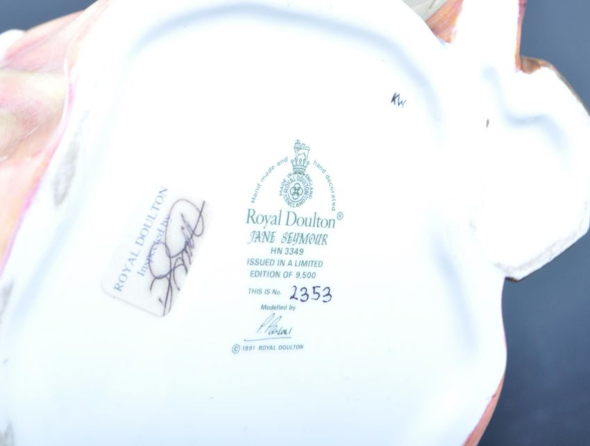 A 20th century Royal Doulton Jane Seymour porcelain figurine standing next to a lute. HN3349. 2353/9500. Makers mark to the underside. Measures 23cm high.