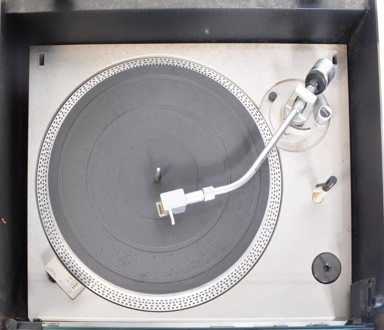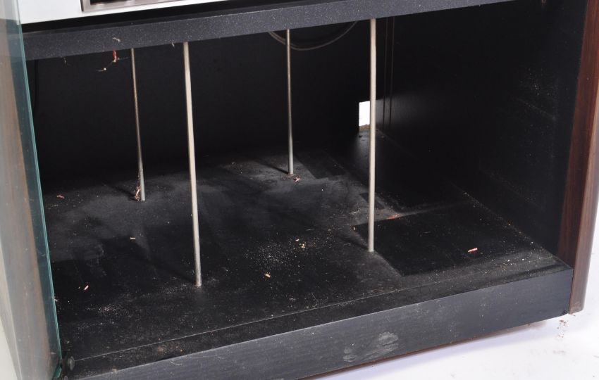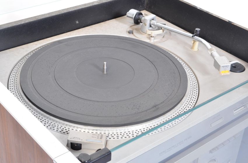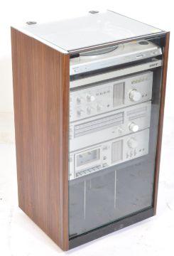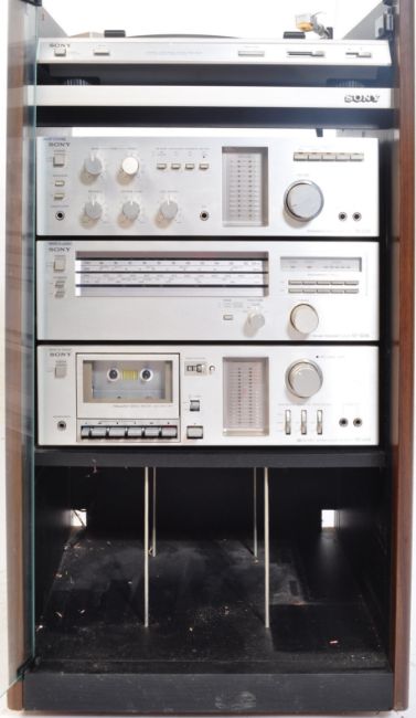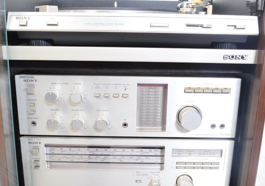 A retro vintage 20th century audio Hi-Fi Sony stacking stereo system within a mahogany and glass case on castors. System to include a turntable record deck with fully automatic direct drive (PS-333), an integrated stereo amplifier (TA-535), a radio with FM-AM program tuner (ST-333L) and a stereo cassette deck (TC-U30).