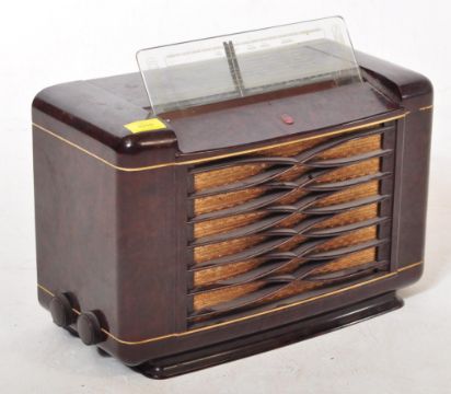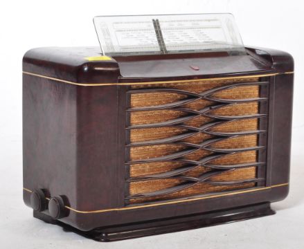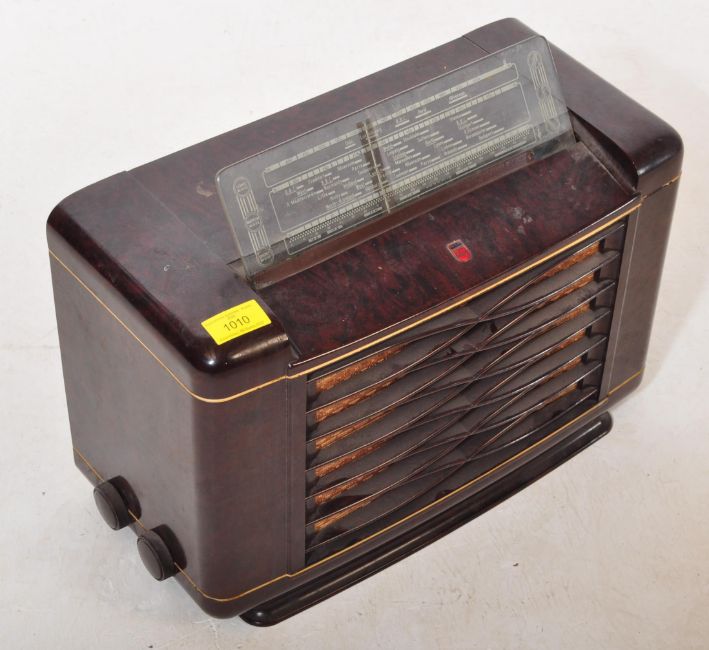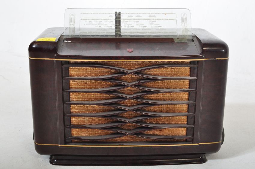 A retro vintage mid 20th Century Philips valve radio. With its radio display on top with turnable knobs and embroidered material front. Model number 59573. Measures approx.