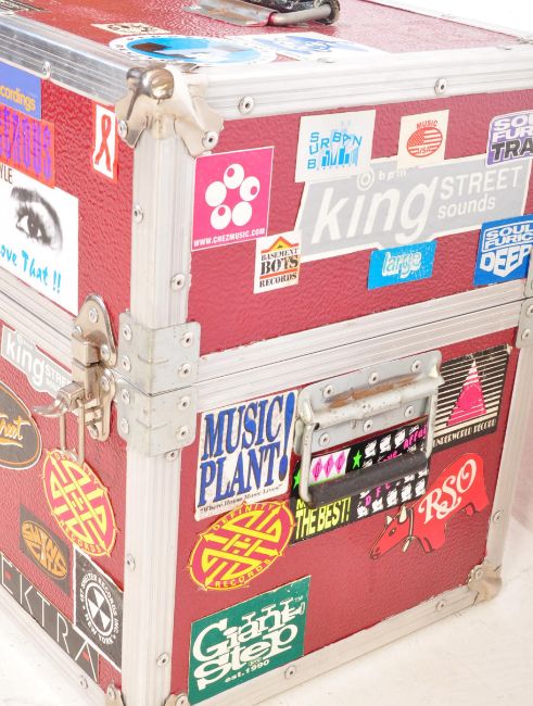 A vintage retro 20th century Hi-Fi LP record flight vase having chrome banding and red leather body having stickers all over.