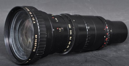 A contemporary Angenieux - Zoom lens f.15 - 150mm lens. Stamped P Angenieux Paris, No 1007712. Measures 20cm long.