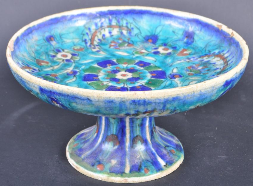 A 19th century Persian tazza / bowl having floral and foliate detailing decorated in blue and turquoise hues raised on a footed base. Measures 11cm high x  21cm wide. Small chip to edge.