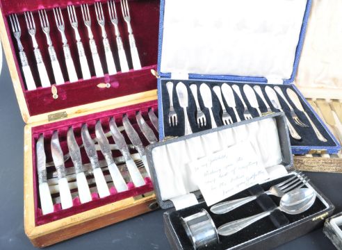 A collection of cased silver plated flatware to include an oak cased canteen of cutlery ( part ) together with cased knives and forks set, cased mother of pearl faux handled knives and forks in box. teaspoons, napkin ring, knife and fork etc . Also some white metal silver souvenir spoons etc.